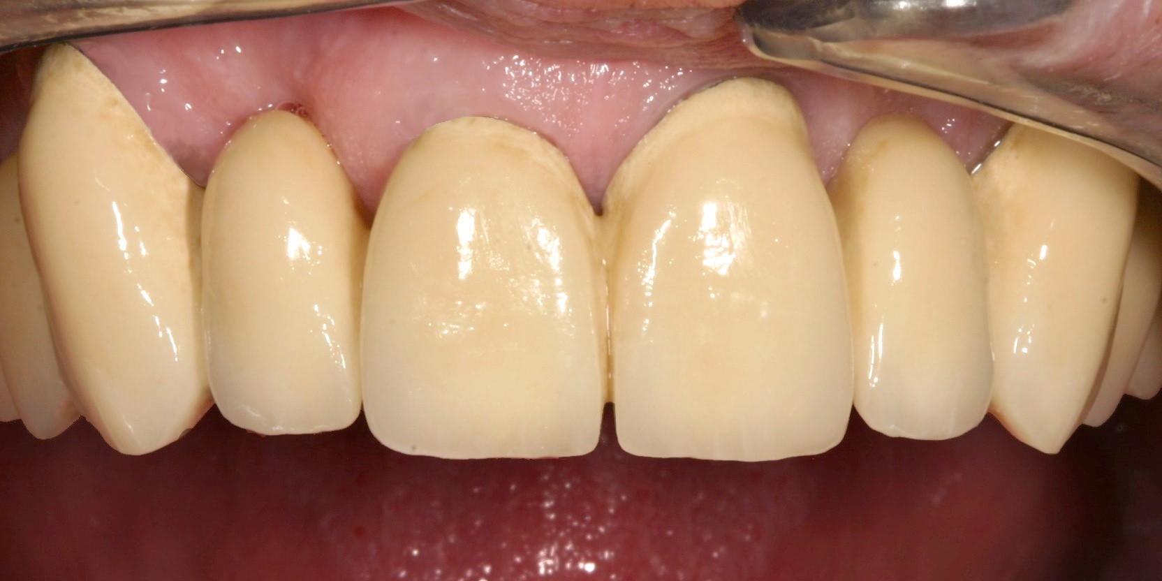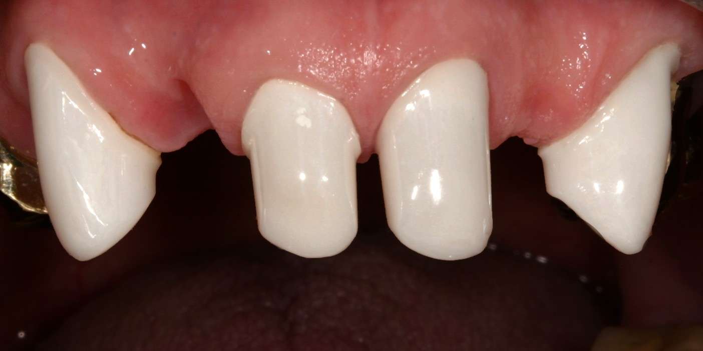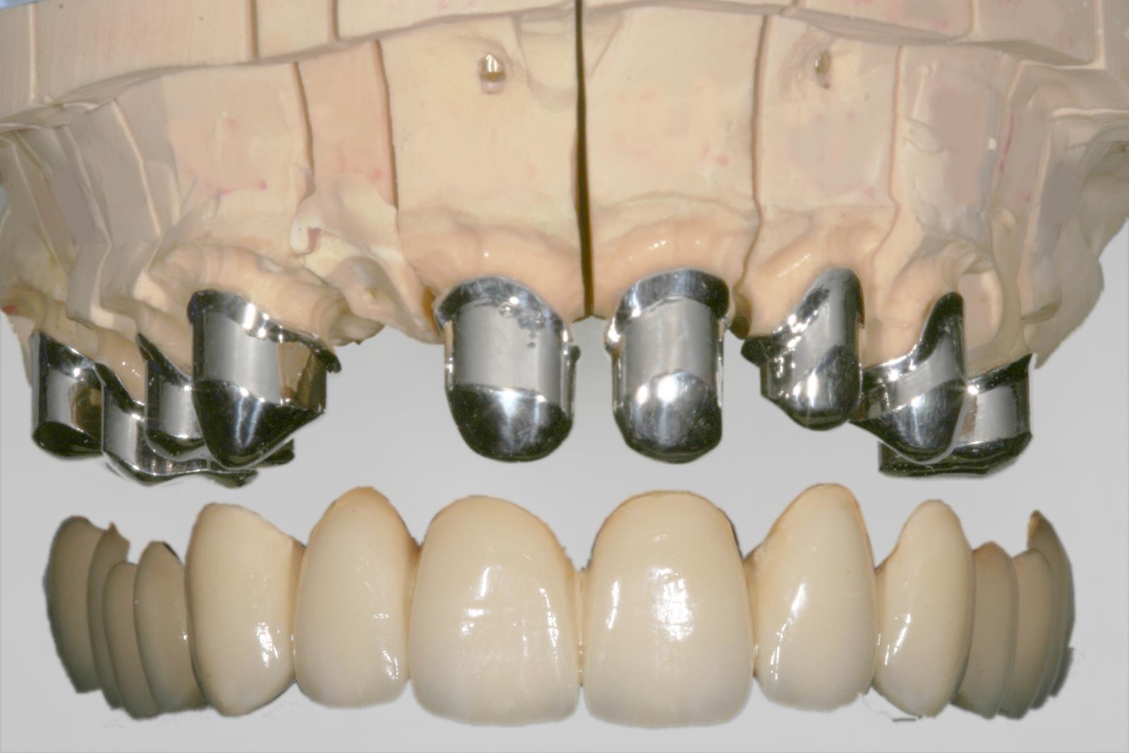 Teleskope aus NEM keramischverblendet, hier wie eine abnehmbare Brücke gestaltet. Teleskope sind Doppelkronen. Die erste Krone (Primärteil) ist außen rundrum parallel gefräst und fest auf dem Zahnstumpf aufzementiert. Die zweite Krone (Sekundärteil) kann über die erste Krone geschoben werden. Durch den Reibewiederstand der beiden Kronen hält die Prothese im Mund. durch ziehen mit beiden Händen an den Zahnreihen der Prothese lässt sich die Prothese lösen und zum Reingen herausnehmen. Um die verbleibenden ersten Kronen (Primärteile) lässt sich dann sehr gut putzen. Auch eventuelle Reparaturen am Zahnersatz können gut außerhalb des Mundes erledigt werden.