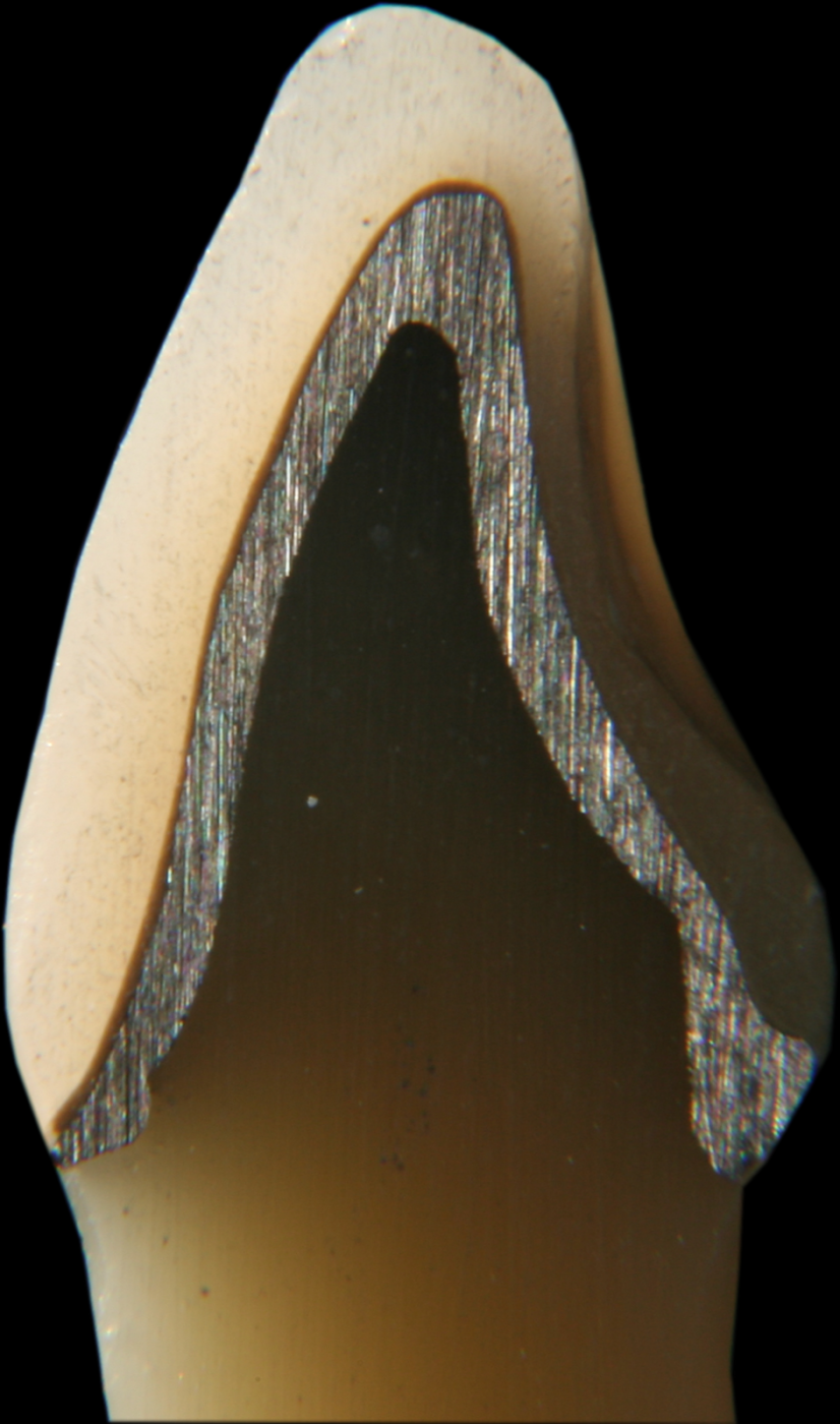 • Metallkeramikkrone im Durchschnitt, man erkennt die Abschattung durch das Metall
