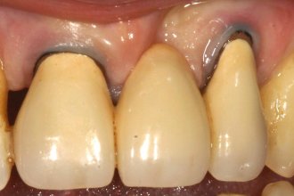 • Metallkeramik: Durch Rückzug des Zahnfleisches sind die dunklen Ränder sichtbar