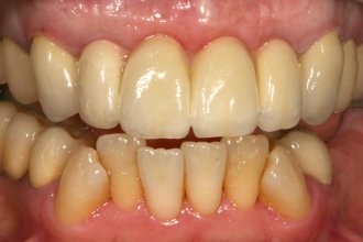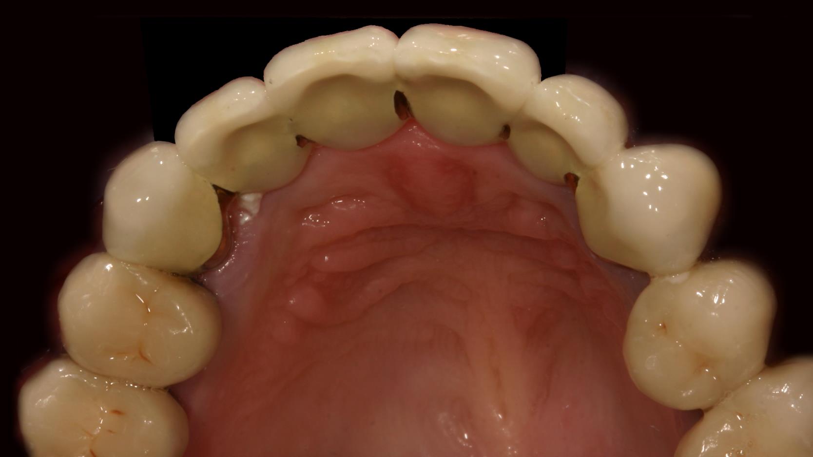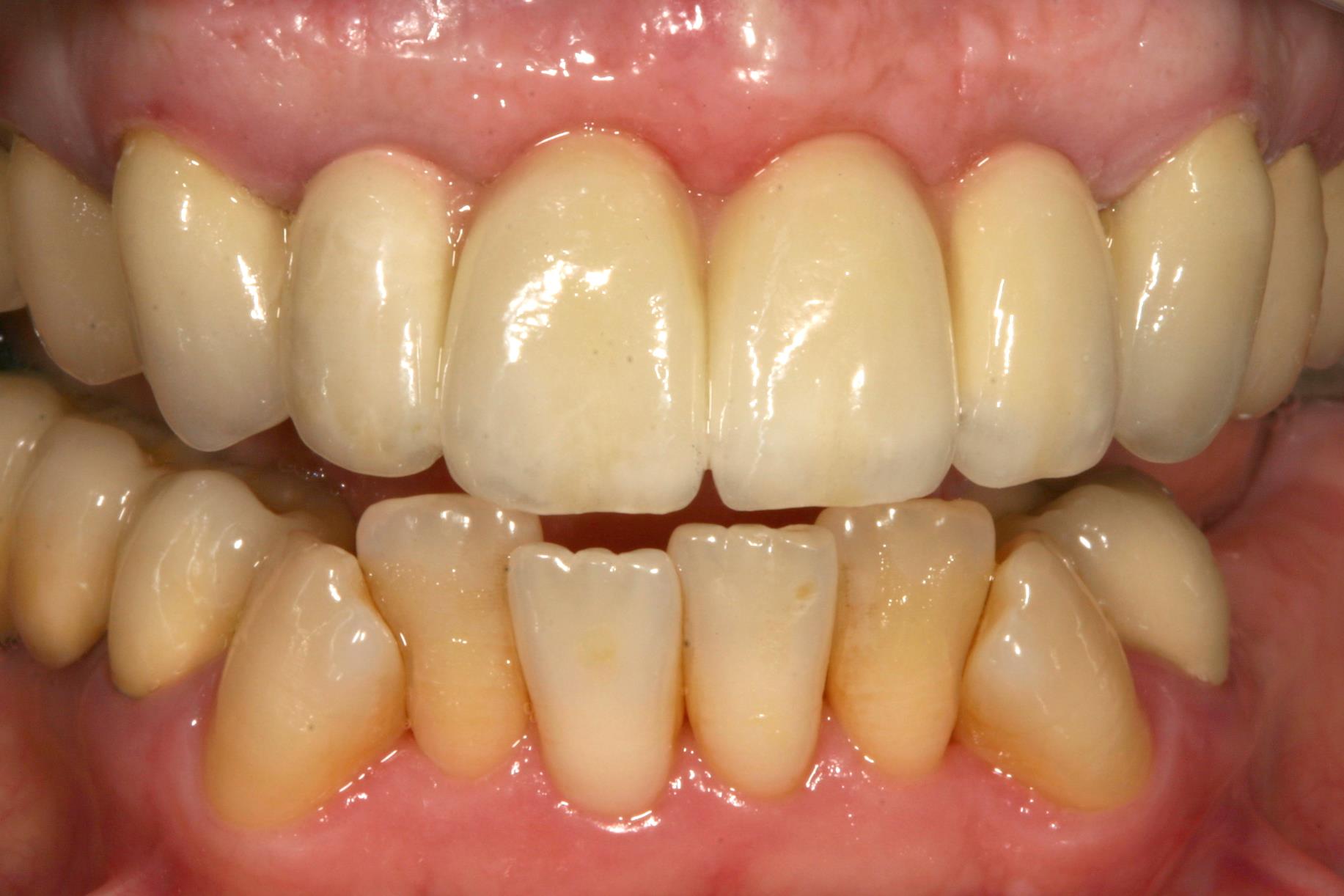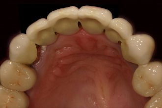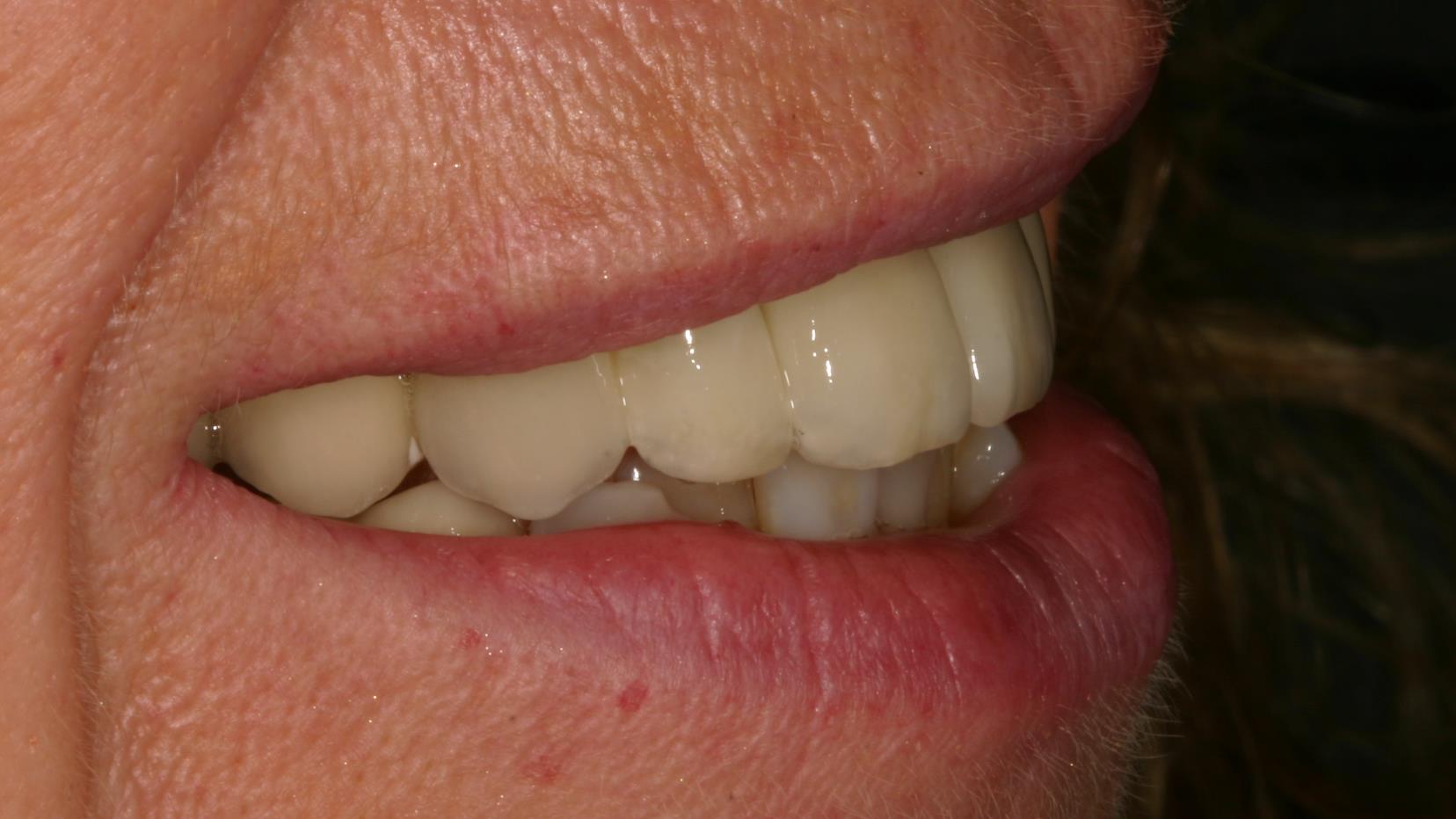 Wenn mehrere Zähne im Frontzahnbereich fehlen, kann man die Lücke durch eine Brücke schließen. Meistens ist dann auch schon der Kieferkamm zurückgeschwunden. Dadurch wirken die Brückenglieder länger. Auch die Zahnfleischpapille fehlt. Hier haben wir sie mit rosa Keramik nachgebildet, um „dunkle Löcher“ zwischen den Zähnen zu vermeiden und die Zähne nicht unnatürlich breit und lang erscheinen zu lassen.