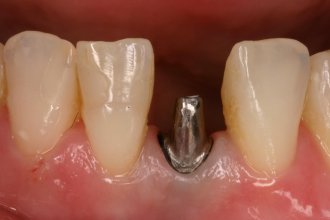 Untere Frontzähne lassen sich nur mit sehr grazilen Implantaten versorgen. Sie bestehen nur aus einem Stück und müssen deshalb im Mund beschliffen werden. Es lassen sich damit gute Ergebnisse erzielen. Der gräuliche Schimmer im Zahnfleischbereich entsteht, weil das darunterliegende Implantat etwas durchschimmert.