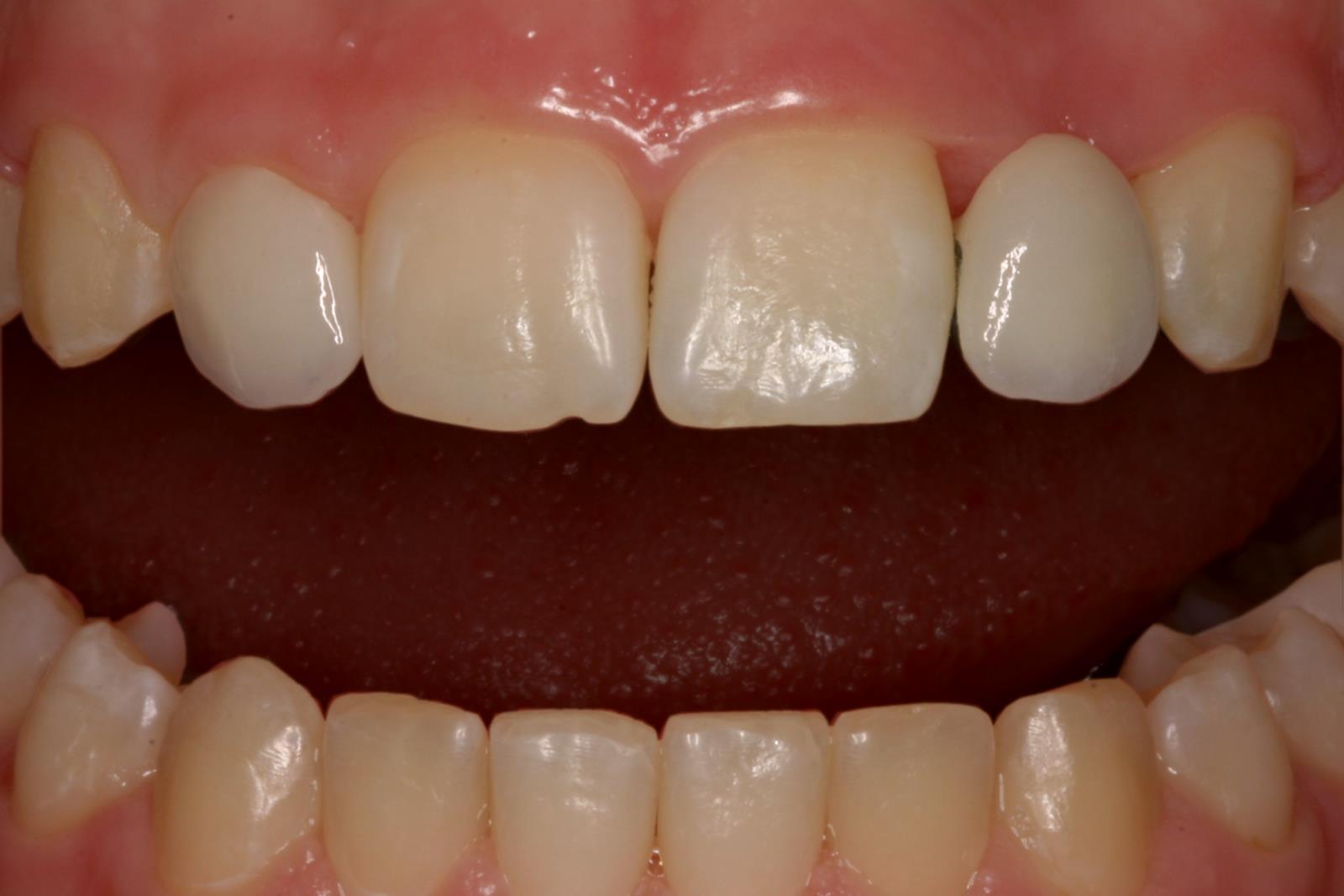 Eine noch recht junge Patientin hatte den den rechten kleinen Schneidezahn als Zapfenzahn ausgebildet und eine Nichtanlage des linken kleinen Schneidezahns. Auf dem rechten fertigten wir ein Veener. Die Lücke wurde als Langzeitprovisorium mit einer Marylandbrücke aus NEM versorgt.