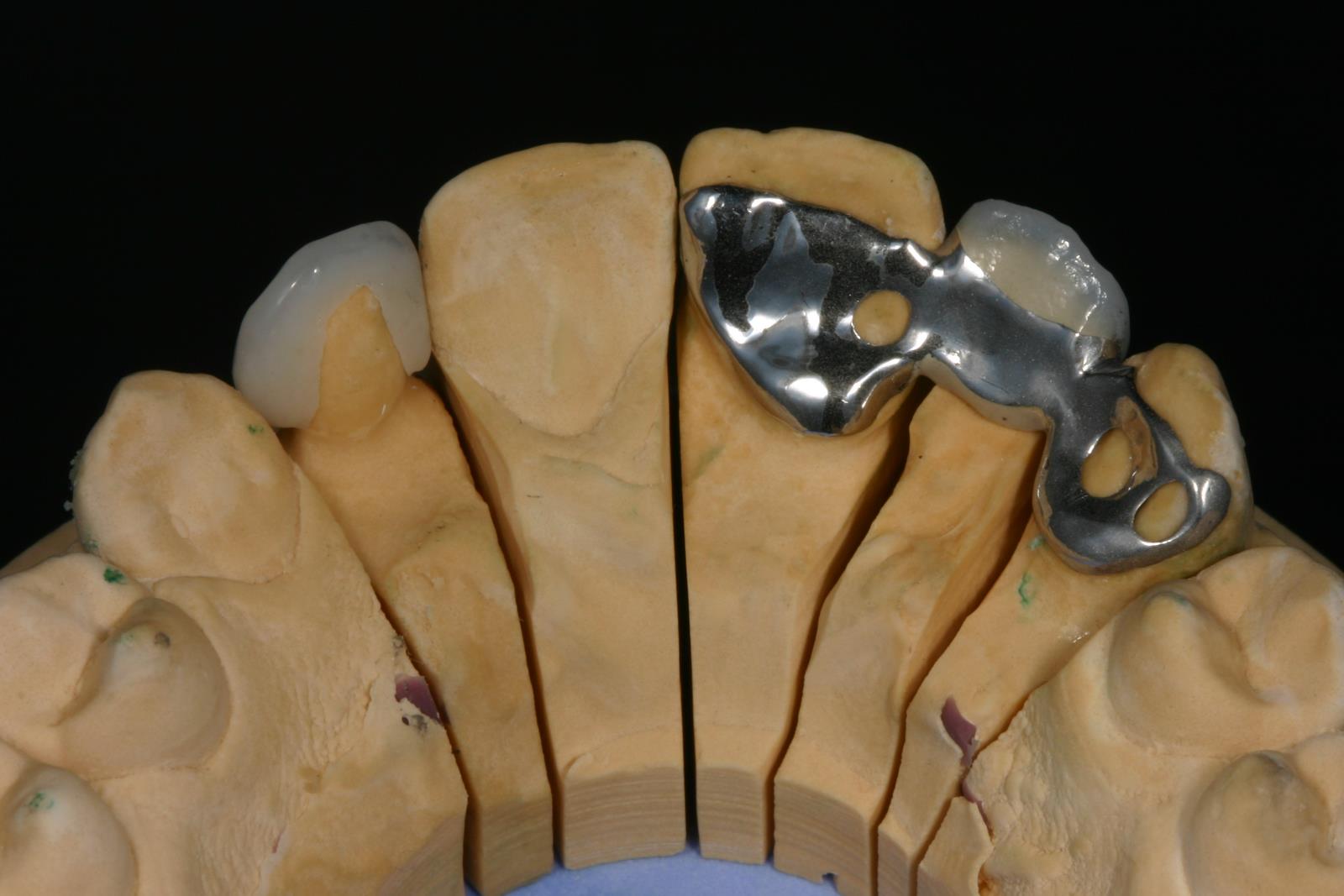 Marylandbrücken aus Vollkeramik sind nicht empfehlenswert, da die aufliegenden Flügel sehr dünn sind und ein Bruch nicht auszuschließen ist. Aufgrund der Kontaktsituation mit den Gegenzähnen und weil wir nichts einschleifen wollten, haben wir die Flügel der Marylandbrücke perforiert.