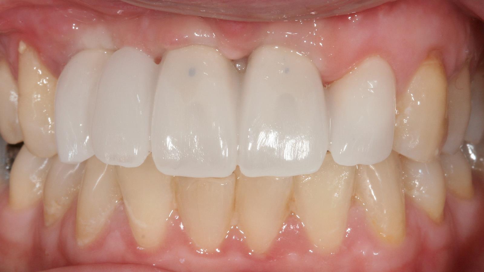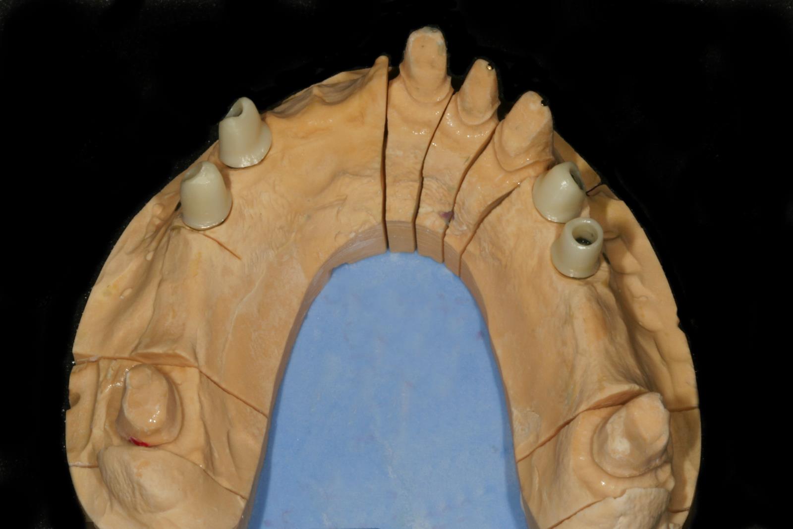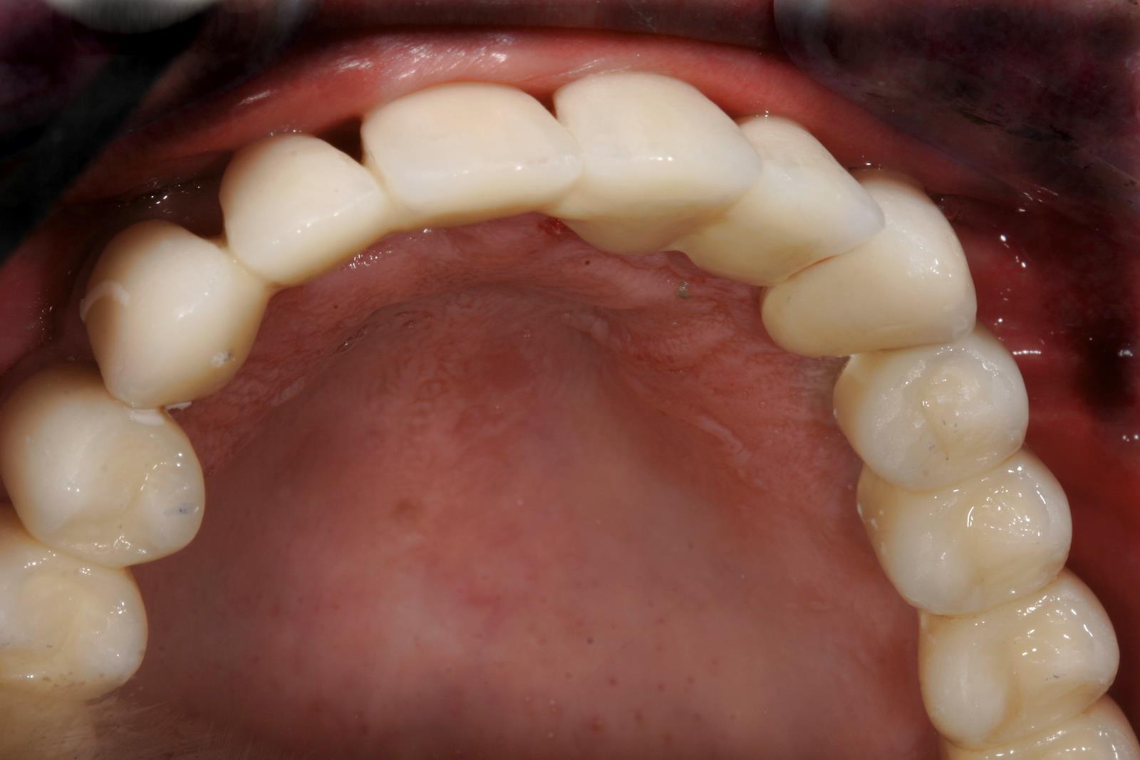 Fall 2 Vollkeramikbrücke auf drei Implantaten. Weil beim Eckzahn auch schon der Kieferkamm zurückgegangen war. steht das Implantat weiter innen.